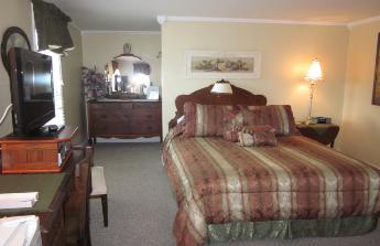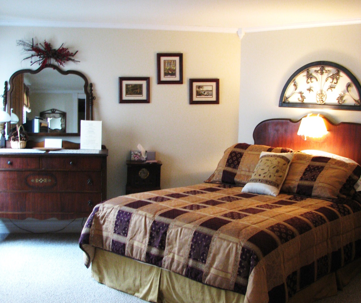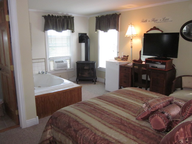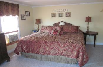 | A comfortable and sunny 2nd floor room with filtered lake views from many of your windows. This room is the namesake for Captain Lycett, the Civil War Captain who built the homestead in 1881, which stayed in the family until 1976. For your relaxing pleasure after a day of activities, we provide: ~ King size antique bed with custom bedding accents, the ultimate in comfort. ~ Two person jacuzzi tub for your enjoyment. ~ In the Fall, Gas fireplace, for immediate ambiance or extra warmth on a chilly night. ~ Many of those little touches that will make your stay comfortable and memorable. $120 Per Night Weekly: $840 Double Occupancy, Taxes not included |