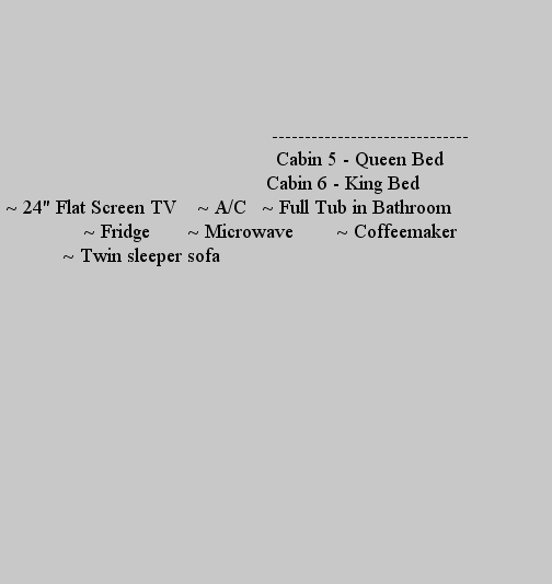 | Units have - A/C, 24" Flat Screen Cable TV Bedrooms have pillow top queen size beds (linens inc.) Kitchen - gas range, fridge, microwave and coffeemaker. (Fully equipped, just bring food & paper products) Sofa lays down into full size bed, (Sofa best for children). Cottage can accommodate 4. |